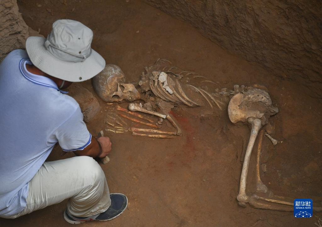考古人員在石峁遺址皇城臺發(fā)現的高等級墓地中進(jìn)行發(fā)掘(2022年8月6日攝)。