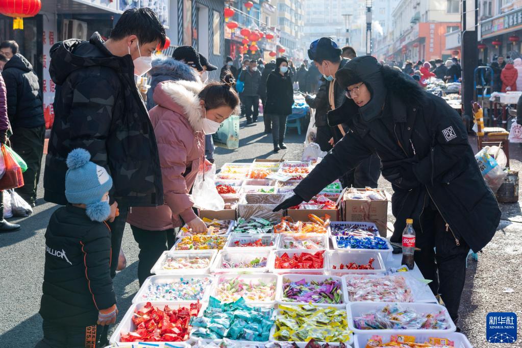 春節臨近,黑龍江省綏芬河市龍須溝步行街的年貨大集十分熱鬧。不少市民前來(lái)選購年貨,迎接新春的到來(lái)。