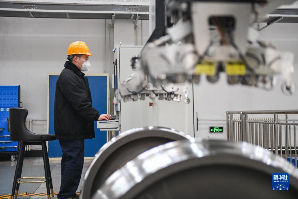 1月12日,在包頭車(chē)輛段檢修車(chē)間輪軸檢修間,工作人員操作設備對輪軸進(jìn)行超聲波探傷。