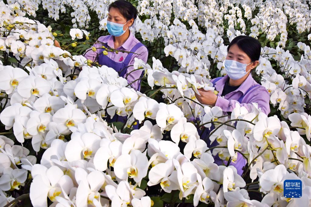 近日,山東省平度市舊店鎮花卉種植基地50萬(wàn)株蝴蝶蘭進(jìn)入盛花期,花工們忙碌著(zhù)整理打包花卉,供應節日市場(chǎng)。