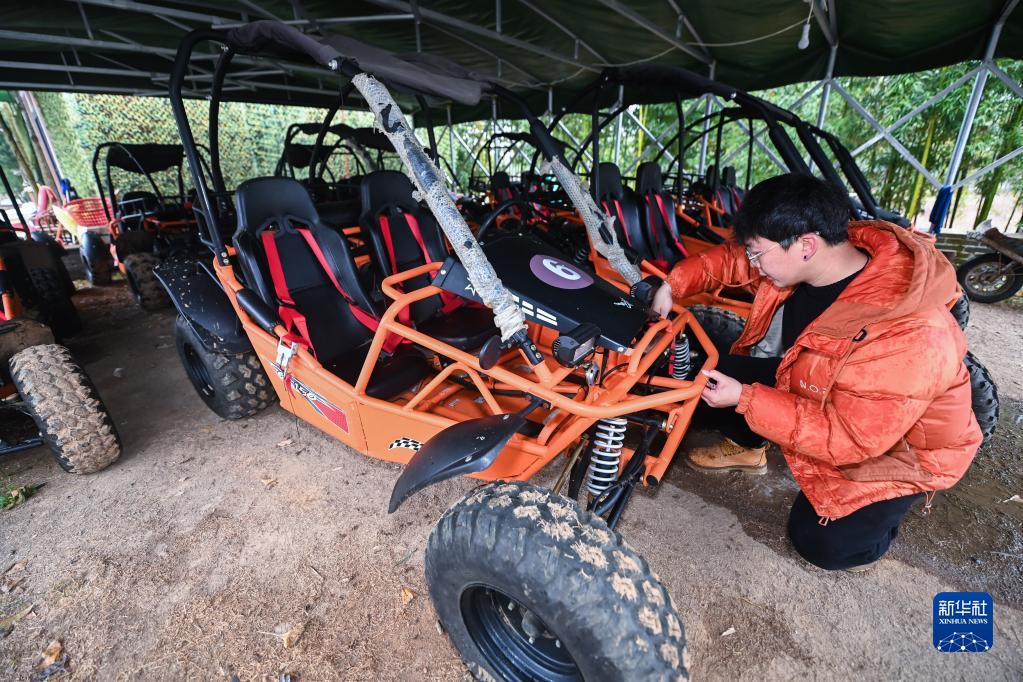 1月13日,在浙江省杭州市臨安區太湖源鎮橫徐村,呂康在檢查民宿里供游客體驗的越野車(chē)。