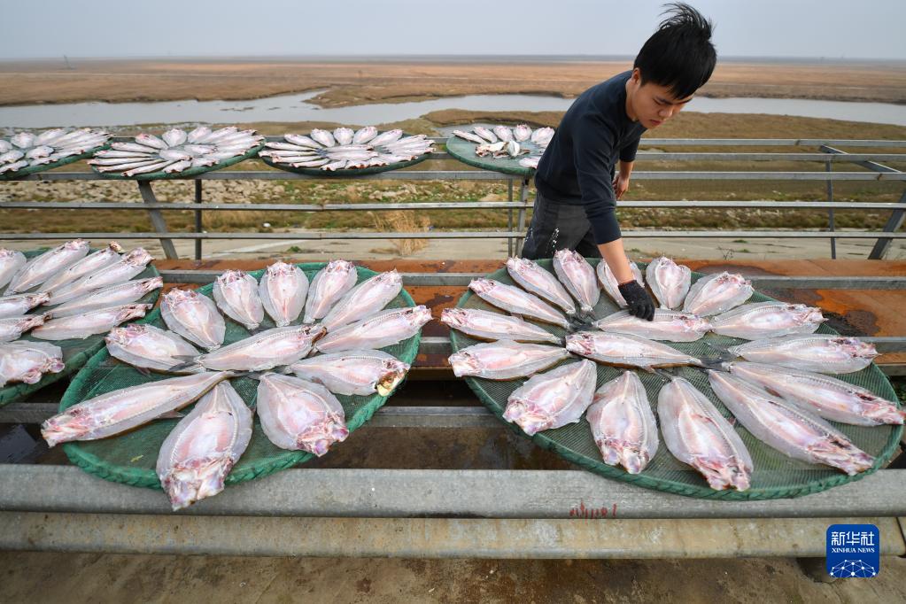 在岳陽(yáng)市君山區錢(qián)糧湖鎮六門(mén)閘社區生態(tài)漁村,居民在晾曬魚(yú)干(1月12日攝)。