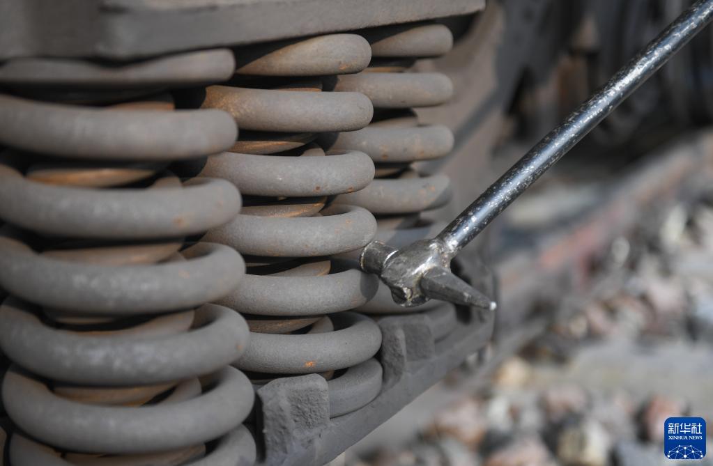 1月12日,吉海清在用檢點(diǎn)錘為萬(wàn)噸大列進(jìn)行敲擊檢查。新華社記者 劉磊 攝