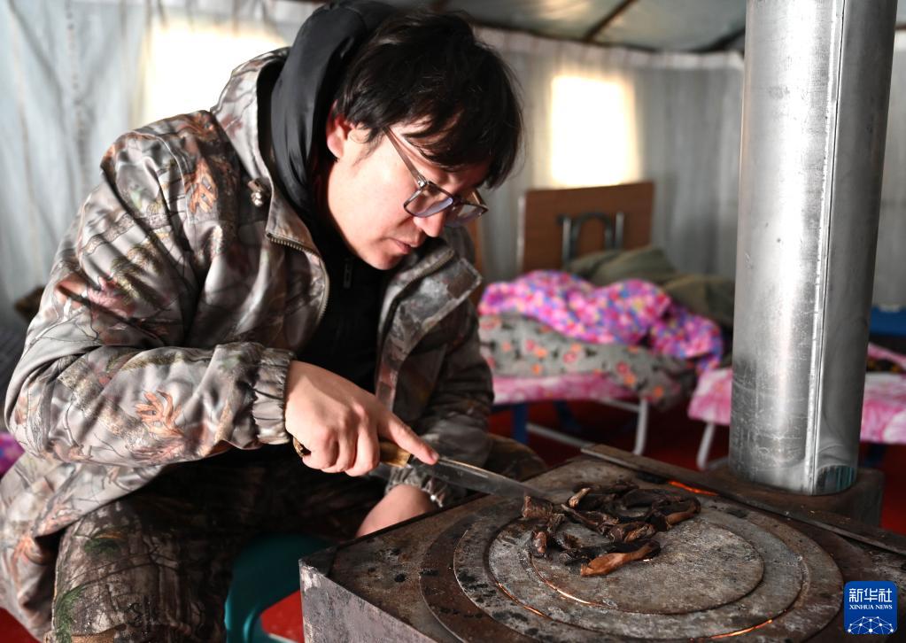 1月12日,覺(jué)樂(lè )在帳篷里的火爐上烤肉干。新華社記者 任軍川 攝