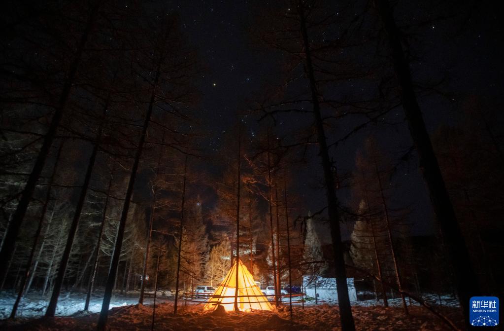 1月11日,覺(jué)樂(lè )的“撮羅子”(鄂溫克族傳統的居所)與密林中的星空相映成輝。新華社記者 費茂華 攝