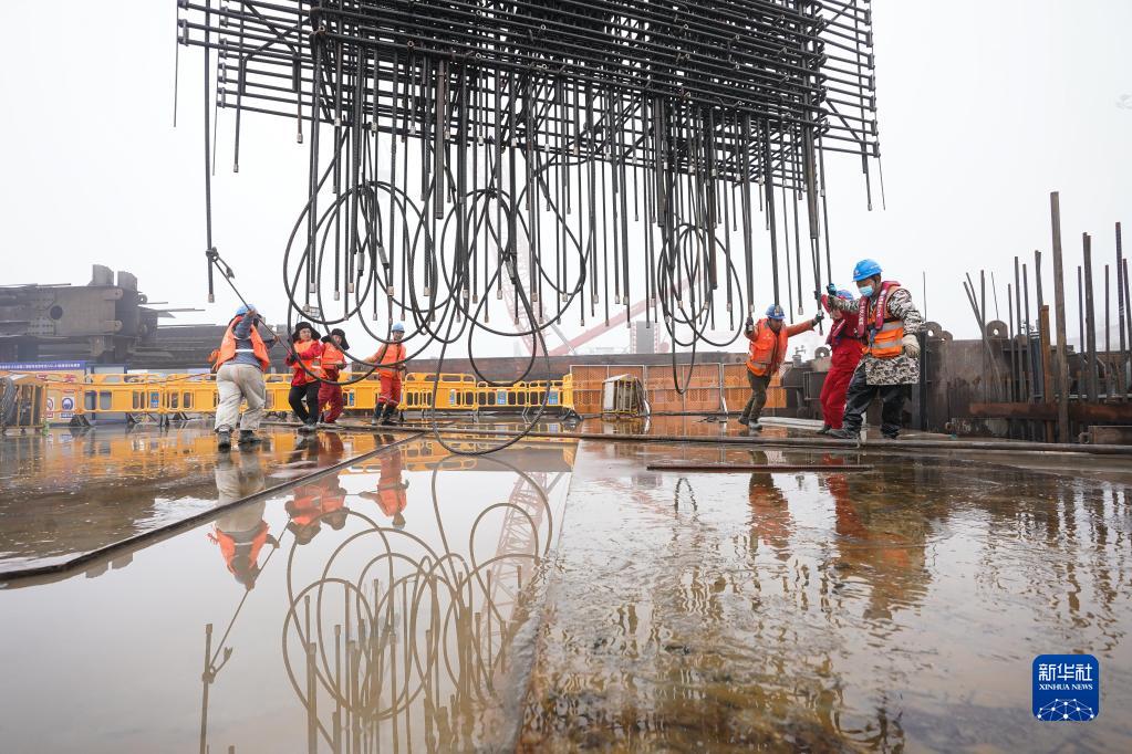1月13日,工人在張靖皋長(cháng)江大橋南航道橋南錨碇施工現場(chǎng)作業(yè)。