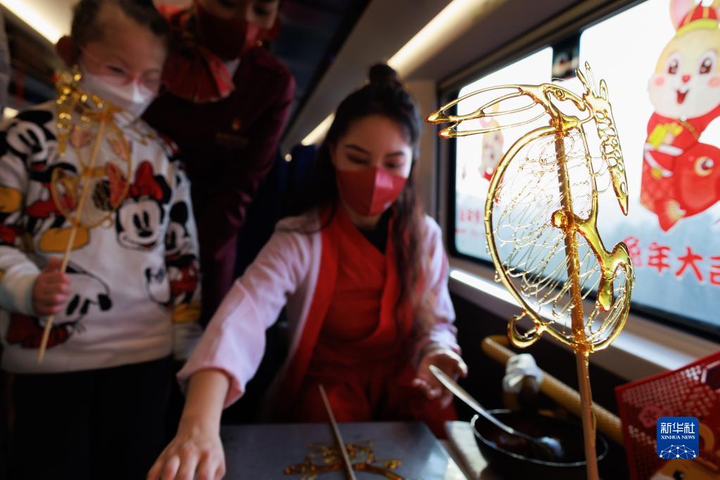 1月13日,工作人員在C5980次列車(chē)上為小朋友畫(huà)糖畫(huà)。