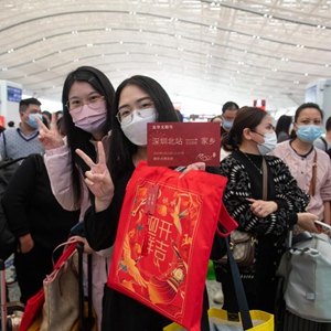 當日,G1008次愛(ài)心專(zhuān)列搭載著(zhù)500多名長(cháng)期在深圳工作的文明實(shí)踐志愿者從深圳北站駛往武漢。G1008次列車(chē)是深圳鐵路部門(mén)今年春運開(kāi)出的第6趟愛(ài)心專(zhuān)列,暖心助力深圳地區的文明實(shí)踐志愿者和城市奮斗者及家人順利回家過(guò)年。新華社記者 毛思倩 攝