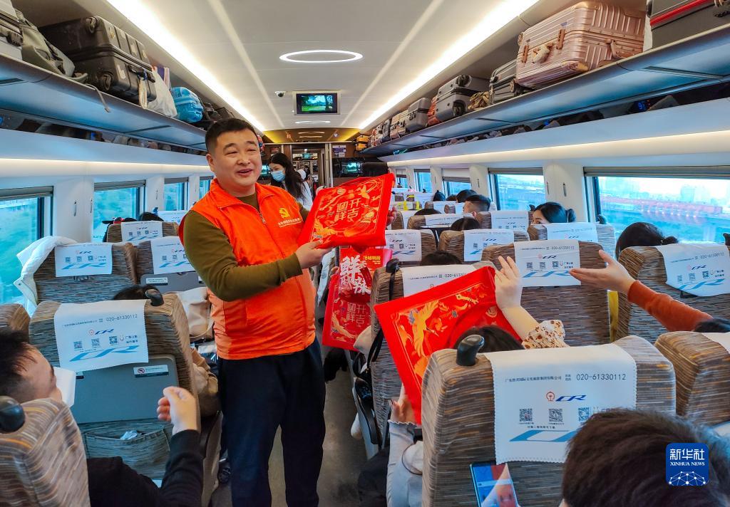 當日,G1008次愛(ài)心專(zhuān)列搭載著(zhù)500多名長(cháng)期在深圳工作的文明實(shí)踐志愿者從深圳北站駛往武漢。G1008次列車(chē)是深圳鐵路部門(mén)今年春運開(kāi)出的第6趟愛(ài)心專(zhuān)列,暖心助力深圳地區的文明實(shí)踐志愿者和城市奮斗者及家人順利回家過(guò)年。新華社記者 毛思倩 攝