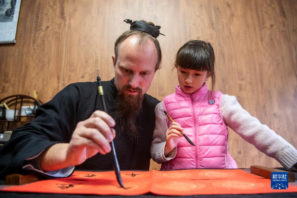 1月12日,杰克在家里和女兒一起寫(xiě)春聯(lián)。