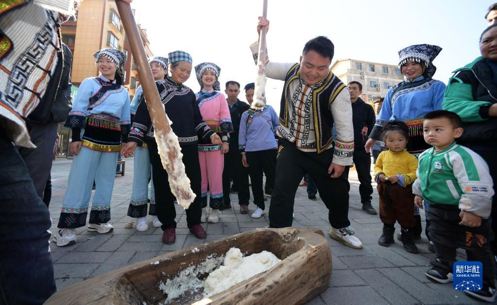 1月13日,當地群眾在羅甸縣木引鎮康夢(mèng)家園參與打糍粑活動(dòng)。