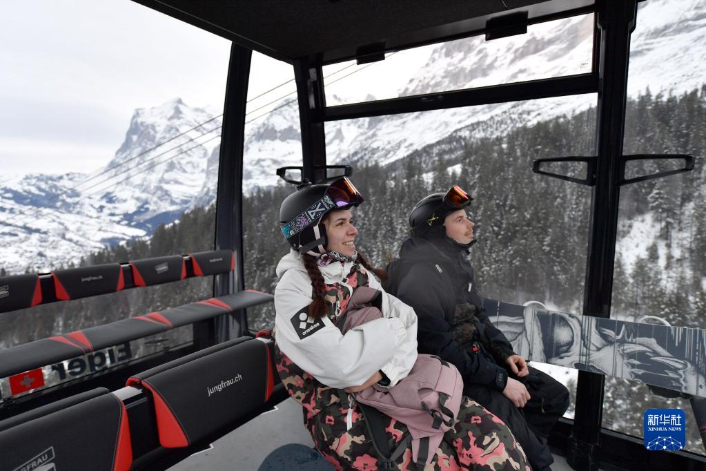 1月12日,在瑞士少女峰,滑雪好者乘坐纜車(chē)上山。