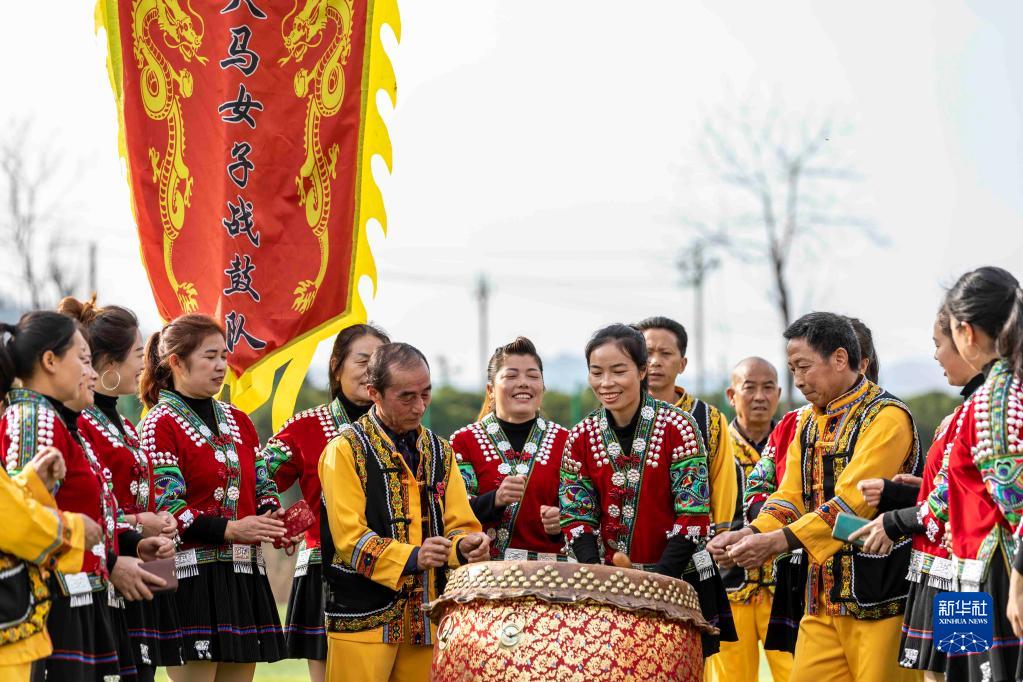 1月13日,在岑鞏縣天馬鎮天馬村,民間藝人在交流“思州戰鼓”表演技藝。