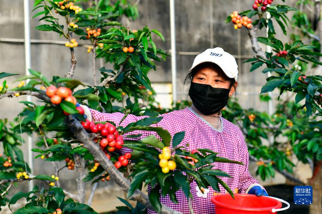 1月14日,在五蓮縣戶(hù)部鄉果樹(shù)大本營(yíng),工作人員在管護設施大棚里的櫻桃。