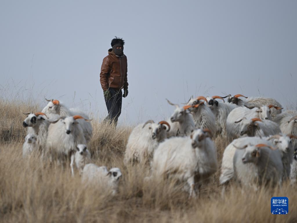 1月13日,在青海湖湖東種羊場(chǎng),牧工在照料羊群。