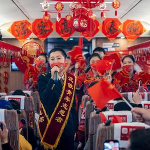 1月13日,在丹東開(kāi)往上海虹橋的G1230次列車(chē)上,列車(chē)乘務(wù)人員為旅客準備了一場(chǎng)熱鬧的高鐵聯(lián)歡會(huì ),在歡歌笑語(yǔ)中迎接農歷小年。