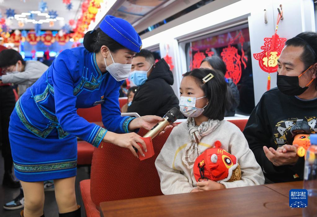 當日正值北方小年,北京開(kāi)往呼和浩特的G2457次復興號列車(chē)被乘務(wù)員們布置得喜氣洋洋。高鐵乘務(wù)員和鐵路烏蘭牧騎隊員們,不僅為旅客奉上一臺精彩演出,還準備了豐富的節日禮品,一路歡聲笑語(yǔ)伴隨著(zhù)乘客。