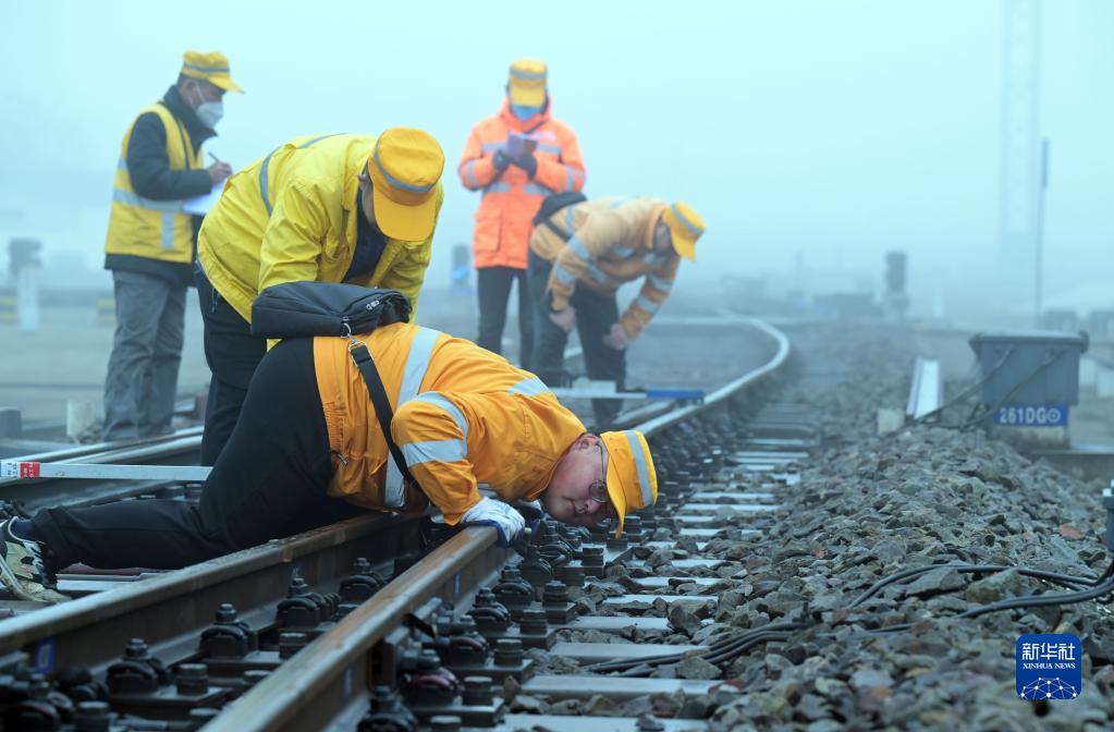 1月13日,中國鐵路上海局集團有限公司合肥工務(wù)段工作人員在合肥東站進(jìn)行設備巡查作業(yè)。