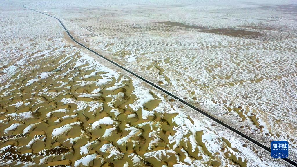 新疆阿克蘇地區沙雅縣以南的塔克拉瑪干沙漠迎來(lái)降雪(1月14日攝,無(wú)人機照片)。