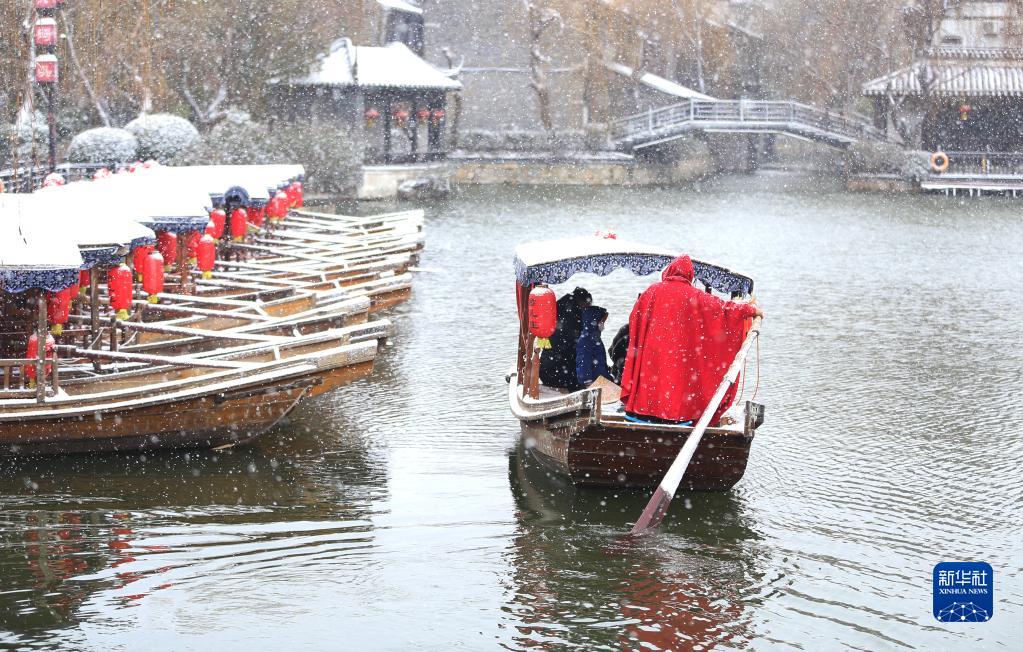 1月14日,在山東省棗莊市臺兒莊古城,游客乘船觀(guān)賞雪景。