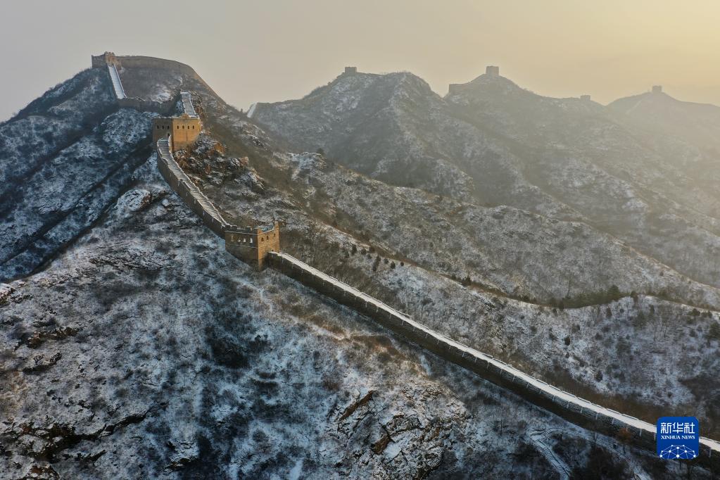 1月13日拍攝的位于河北省承德市灤平縣金山嶺長(cháng)城雪景(無(wú)人機照片)。