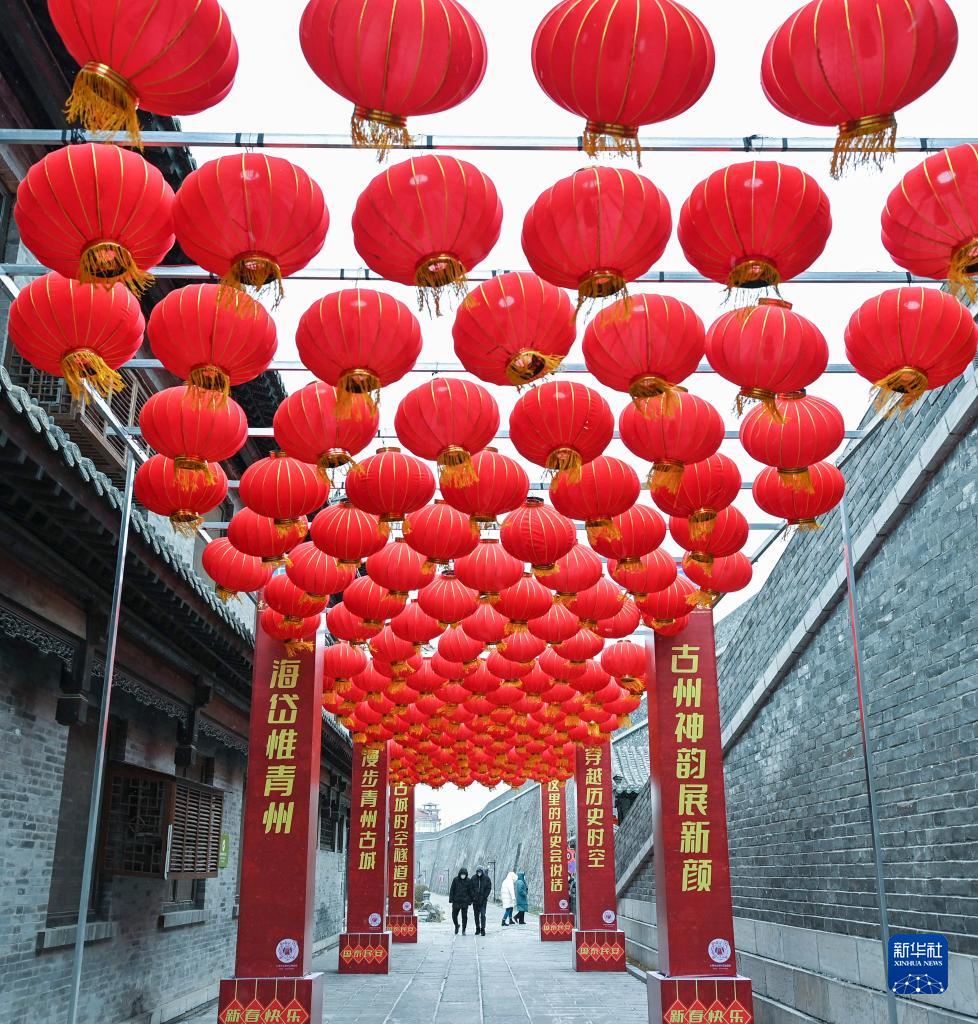 1月14日,游客在山東省青州古城景區賞燈游玩。