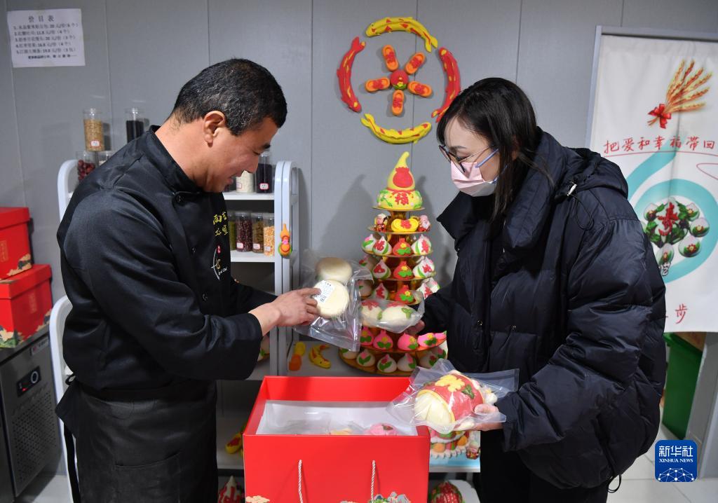 1月13日,市民(右)在挑選花饃產(chǎn)品。