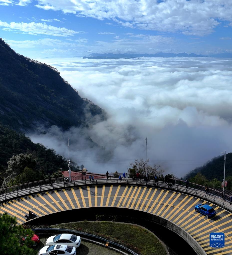 1月14日,游客在福州鼓嶺觀(guān)景平臺欣賞平流霧景觀(guān)(無(wú)人機照片)。