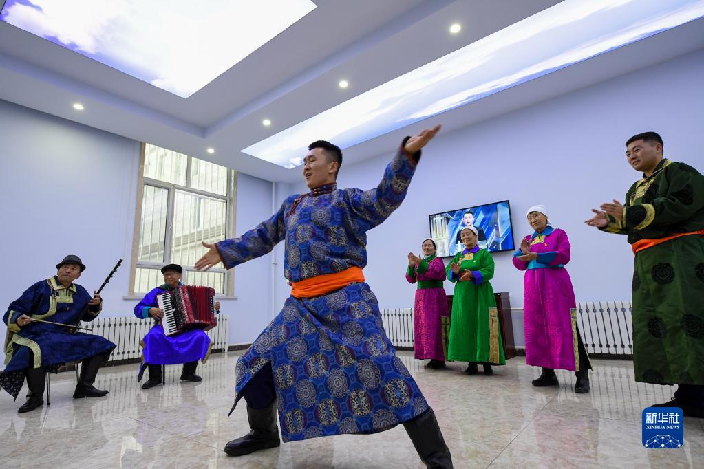 1月8日,西烏珠穆沁旗消防救援大隊消防員愛(ài)勇其(中)和當地群眾排練文藝節目,迎接春節的到來(lái)。