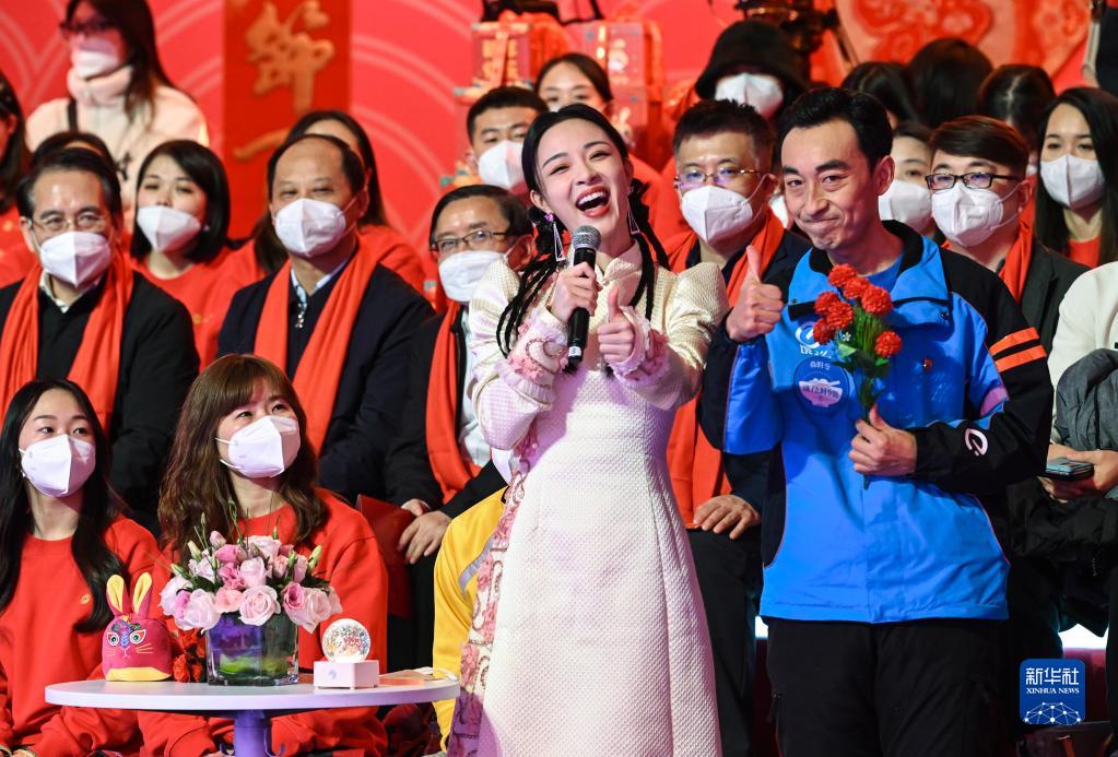 1月13日,抗疫保供黨員代表、“餓了么藍騎士”李雪貞(前排右一)受邀在新春聯(lián)誼會(huì )現場(chǎng)為觀(guān)眾送上祝福。