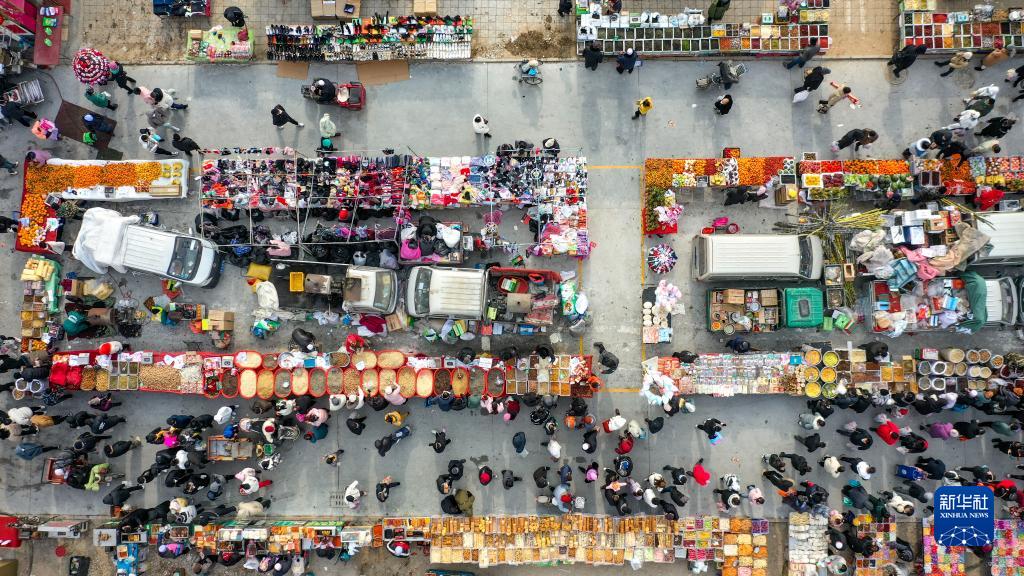 1月14日,人們在賀蘭縣金貴大集上選購年貨(無(wú)人機照片)。