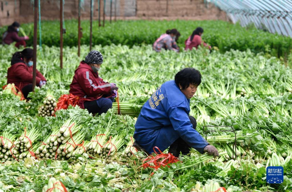 1月13日,工人在西安市高陵區何村的蔬菜大棚里采收芹菜。
