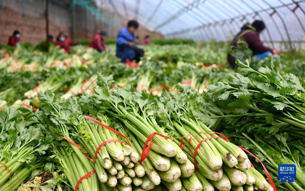 1月13日,工人在西安市高陵區何村的蔬菜大棚里收獲芹菜。