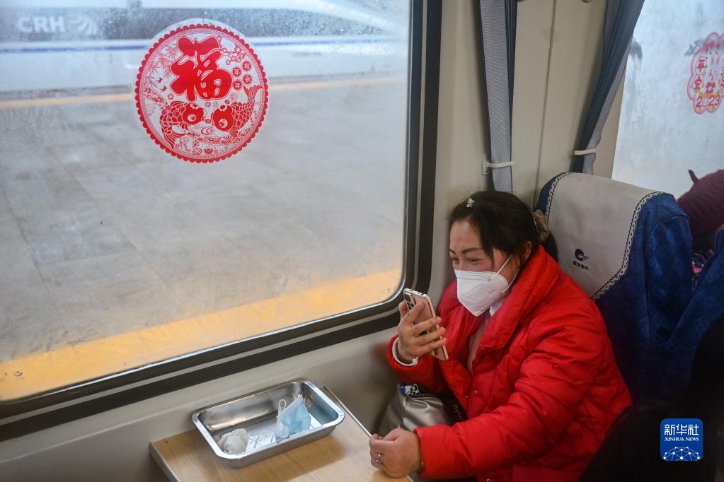 1月13日,在福州火車(chē)站,川籍務(wù)工人員在K1268次列車(chē)上和家人視頻。
