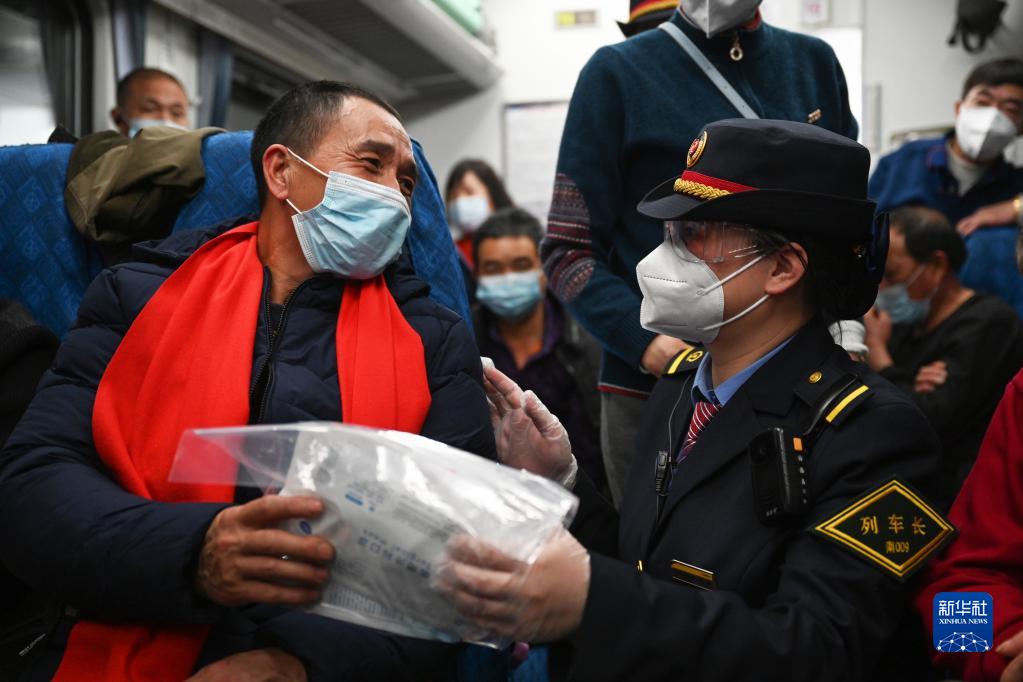 1月13日,乘務(wù)員在K1268次列車(chē)車(chē)廂里為乘客發(fā)放防疫健康包。