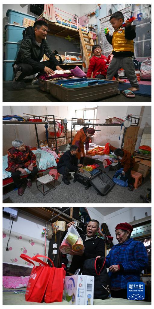 拼版照片,從上到下依次為:川籍務(wù)工人員李小鐵(左一)及其兒女在福建福州的出租屋內收拾行李(1月12日攝);川籍務(wù)工人員常玉鳳(左三)及其家屬在福建晉江的出租屋內收拾行李(1月12日攝);川籍務(wù)工人員曾傳富(左一)及其母親在福建福州的出租屋內收拾行李(1月12日攝)。