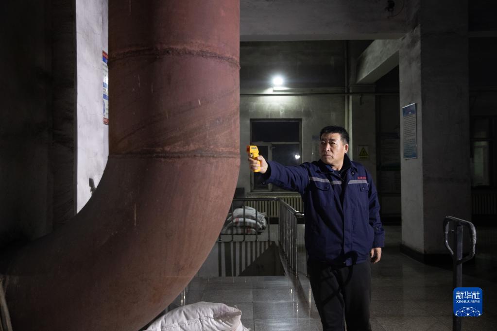 1月12日,工作人員在漠河華美供熱有限公司鍋爐房?jì)葴y量管道溫度。