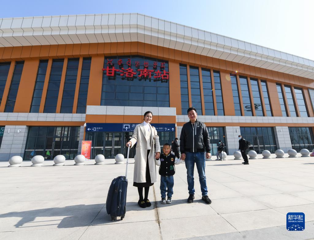 1月12日,在甘洛南站,退乘回家的阿依布卡(左)、丈夫阿木古乃(右)和兒子邱煜揚在站前廣場(chǎng)合影。新成昆鐵路的全線(xiàn)貫通運營(yíng),也極大縮短了她回家的時(shí)間。