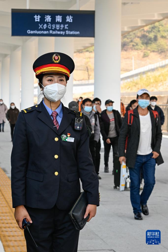 1月11日,在甘洛南站,阿依布卡在站臺上迎接旅客上車(chē)。