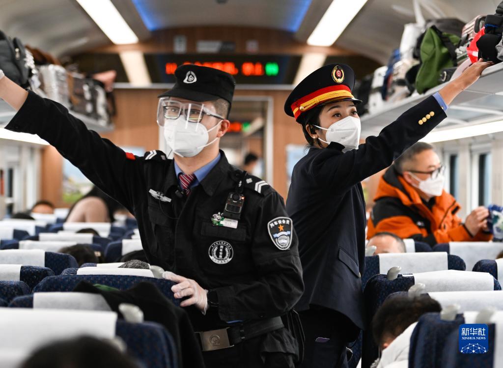 1月11日,在C43次列車(chē)上,阿依布卡(右)和列車(chē)安全員在車(chē)廂巡視。