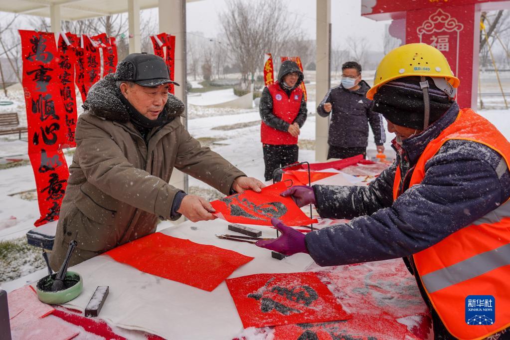 1月14日,書(shū)法愛(ài)好者在現場(chǎng)書(shū)寫(xiě)春聯(lián)、福字,贈送給工友。