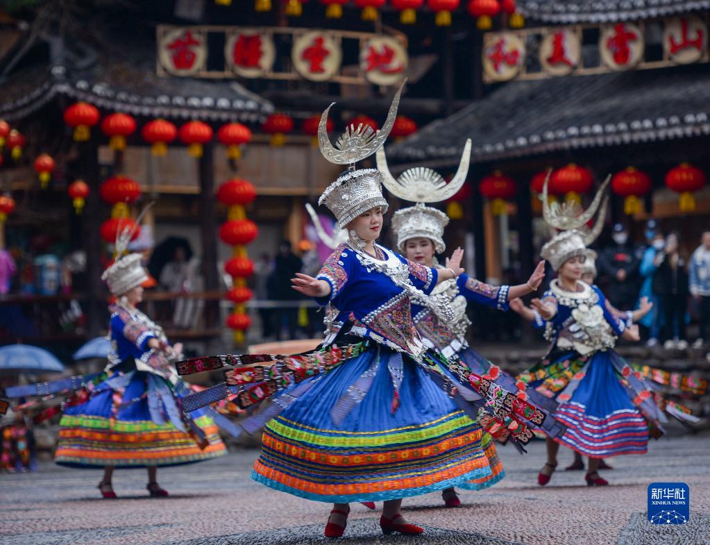 新春將至,在貴州省黔東南苗族侗族自治州雷山縣西江鎮,盛裝打扮的村民載歌載舞,熱鬧迎佳節。新華社發(fā)(龍順偉 攝)