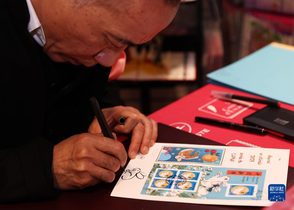 1月14日,在法國巴黎舉行的兔年生肖郵票發(fā)行儀式上,郵票設計者陳江洪為集郵愛(ài)好者簽售兔年生肖紀念郵票。