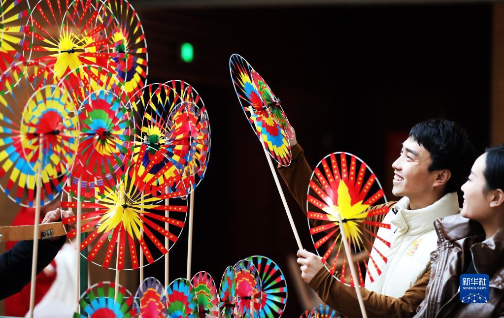 1月14日,人們在山東省臨沂市“非物質(zhì)文化遺產(chǎn)月”活動(dòng)現場(chǎng)觀(guān)賞民間藝人制作的風(fēng)車(chē)。