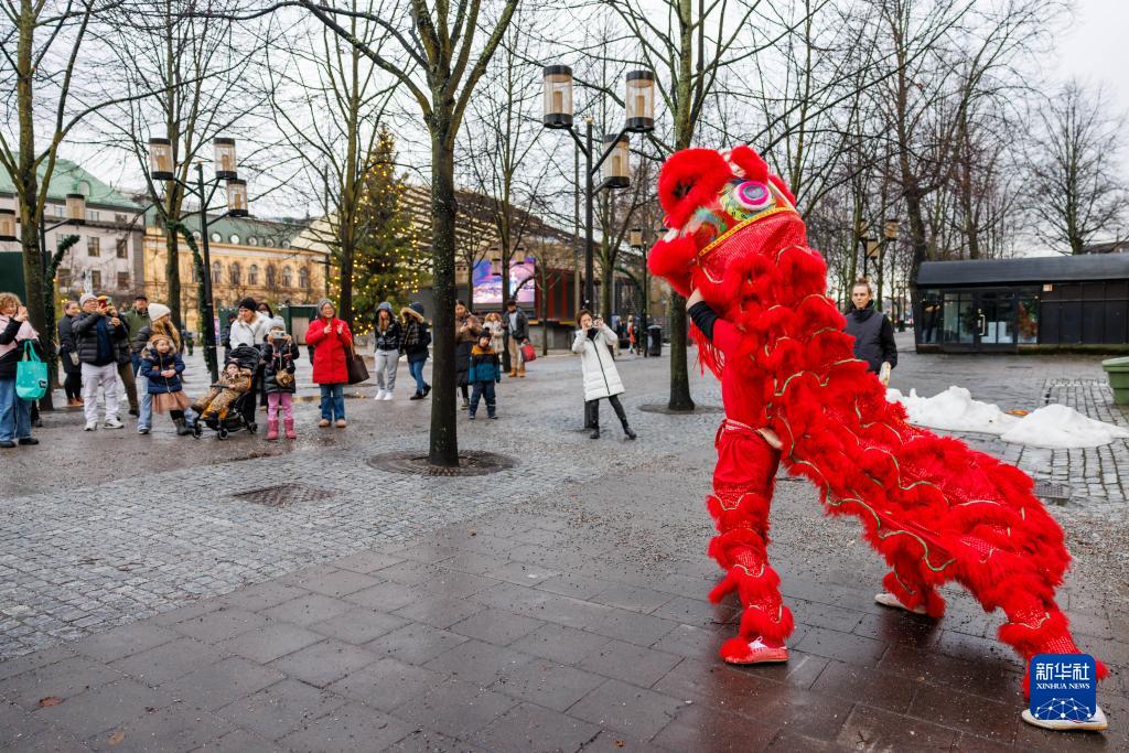 1月14日,人們在瑞典斯德哥爾摩中國文化中心外觀(guān)看舞獅。
