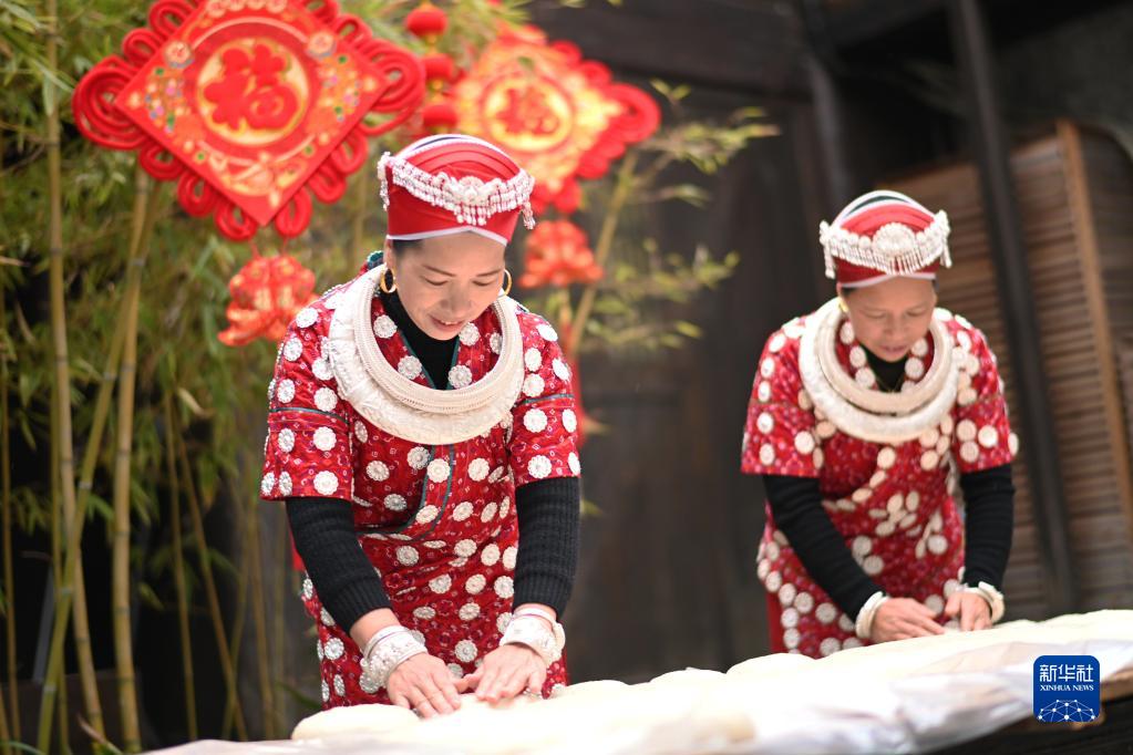 當日,在貴州省黔東南苗族侗族自治州黃平縣舊州古鎮,當地村民蒸香糯、打糍粑,喜氣洋洋地迎接農歷新年的到來(lái)。