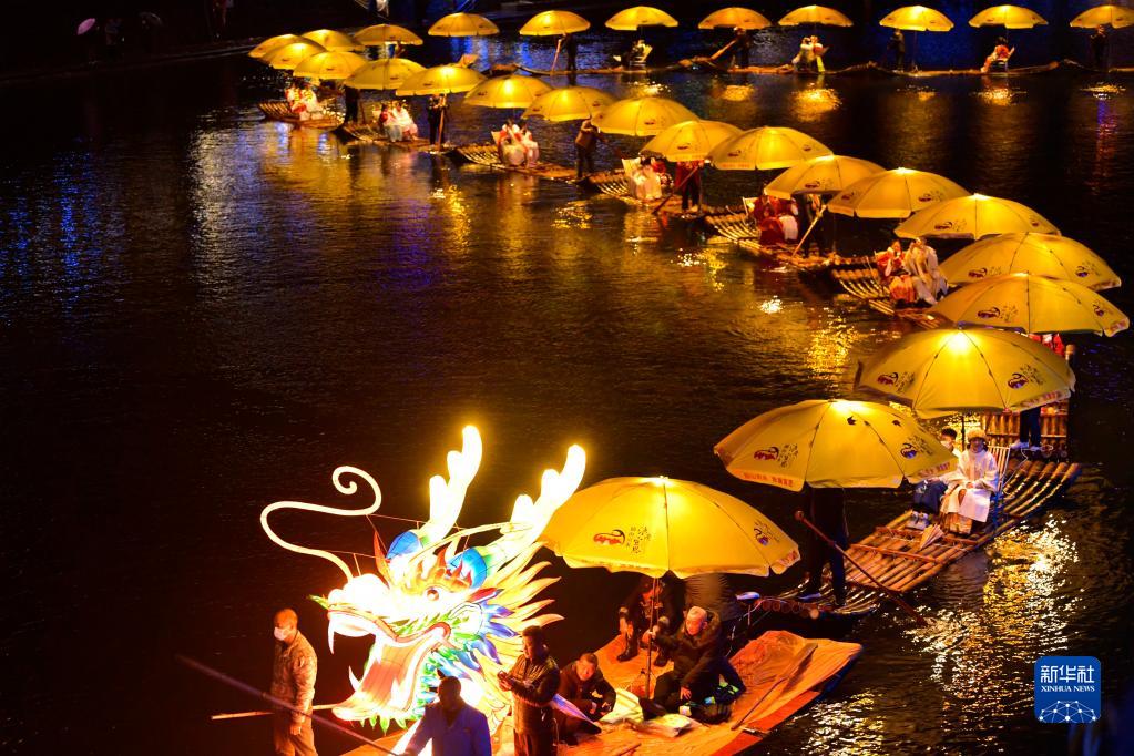 當日,在湖北省恩施土家族苗族自治州宣恩縣貢水河上,一場(chǎng)“貢水游龍”迎新春活動(dòng)吸引不少市民游客參與體驗?!柏曀锡垺庇蓴凳畻l竹筏作“龍身”,輔以燈光、音樂(lè ),人們可以在貢水河上“乘龍”觀(guān)賞璀璨夜景,歡樂(lè )迎新春。