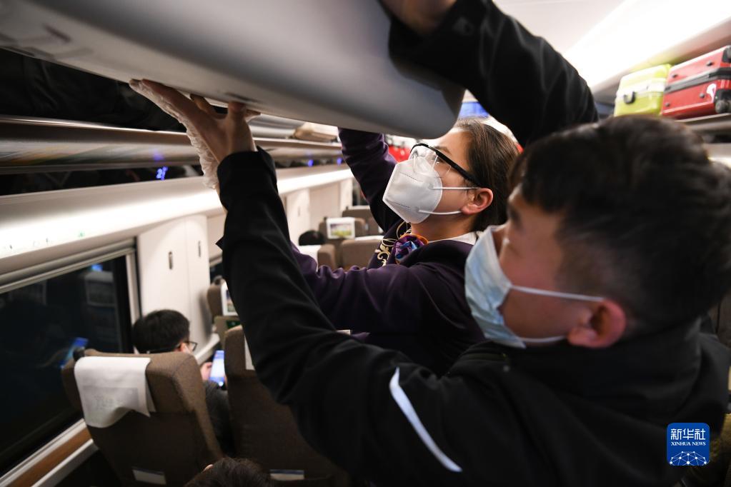 1月14日凌晨,在上海虹橋開(kāi)往亳州南的G9480次高鐵列車(chē)上,中國鐵路上海局集團有限公司合肥客運段列車(chē)員王昊(后)幫助旅客擺放行李。