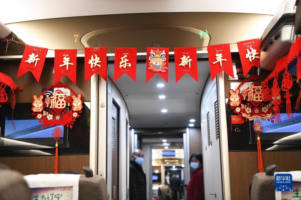 1月14日凌晨,上海虹橋開(kāi)往亳州南的G9480次高鐵列車(chē)上洋溢著(zhù)濃濃的年味。
