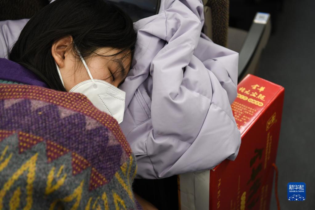 1月14日凌晨,在上海虹橋開(kāi)往亳州南的G9480次高鐵列車(chē)上,一名旅客進(jìn)入夢(mèng)鄉,身旁擺放著(zhù)她要帶回老家的年貨。
